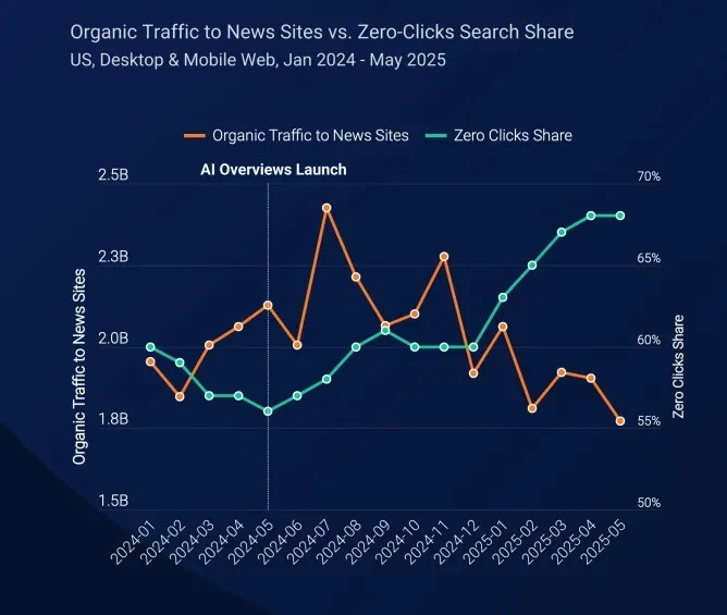 Theo Similarweb, tỷ lệ tìm kiếm tin tức trên web không tạo ra bất kỳ lượt nhấp nào đã tăng từ 56% lên 69% vào tháng 5/2025. Dù Google cho rằng AI Overview vẫn là nguồn dẫn lưu lượng đáng kể, nhiều chuyên gia cho rằng nó chưa đủ mạnh để bù đắp sự sụt giảm thực tế về số lượng nhấp chuột.